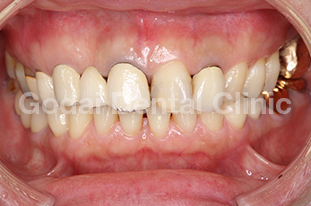 患者様は30代女性、前歯の被せ物が古くなってきて見た目が気になるのを改善したいという主訴で来院されました。小さい頃に転んで前歯を折ってしまい、その時に被せ物の治療をしたそうです。口の中…