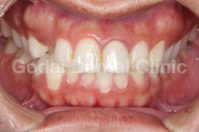 患者様は20代男性、前歯の歯並びを改善したいという主訴で来院されました。口の中を診査していくと、右上の前歯が反対咬合になっており、そこだけ暗く見えてしまう状態でした。患者様はできれば前…