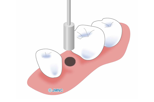 この方法は、“切らない・縫わない・腫れない”を実現した、患者負担の極めて少ない新しいインプラント手術法です。メスを使用せず、「歯肉パンチ」と呼ばれる専用の器具でわずか数ミリの小さな穴を開け、そこからインプラントを埋入します。切開を伴わないため、出血・腫れ・痛みが最小限に抑えられ、術後の縫合や抜糸も不要です。多くの患者さんが「こんなに楽だとは思わなかった」と驚かれます。