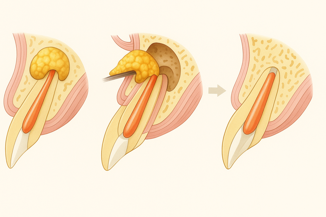この治療法は、歯ぐきを外側から小さく切開し、炎症を起こしている根の先端と膿の袋を直接取り除く外科的アプローチです。感染源そのものを確実に取り除くことで、通常なら抜歯と診断されるような歯でも、再び機能を取り戻せる可能性があります。実際、当院では他院で「抜歯」と言われた患者さんの多くが、この治療によって歯を残すことに成功しています。