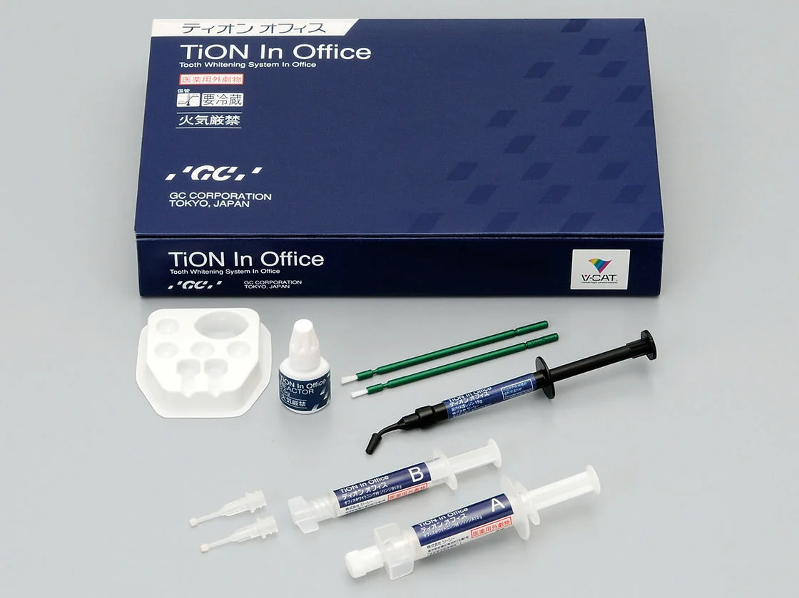 Tion(ティオン)オフィスホワイトニングを利用しています。Tionは低刺激でありながら高いホワイトニング効果を目指せる点が特長です。歯の表面だけでなく、内部に沈着した着色にも作用する薬剤を使用し、自然で透明感のある白さへと導きます。刺激を感じにくい処方のため、「ホワイトニングはしみそうで不安」という方にも配慮された方法です。短期間で効果を実感したい方、初めてホワイトニングを受ける方にも選ばれているオフィスホワイトニングです。